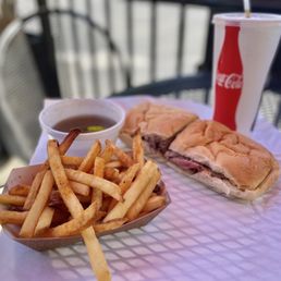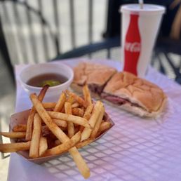 Would I come back? Yes - but to try something else.The French dip was ~fine~. Good quality, tender meat, but very bland. They have a sign on the wall saying it is high quality corn-fed beef in case that matters to you.The onion rings were good. My friend got the fries and they were good. The bread pudding was good - not THAT flavorful (despite their Jack Daniel’s Bourbon sauce) and more on the gooey side of bread pudding. The homemade root beer was good. All in all, a good place to eat but not very exciting.We saw the employees trim the meat and throw away (!!) the outside layer with all the spices. Isn’t that the best part? Certainly would have made the sandwich less bland.I’d like to try the beef brisket or tri-tip when I come back. I don’t think I’d recommend the French dip just because it was underwhelming. If you do get the French dip, maybe spend the extra cents to add cheese, jalapeños or onion.